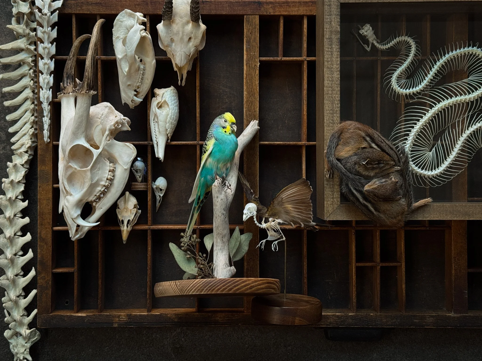 ideas for you: skulls and bones, duh, but we just got in some wonderful new specimens. Our double glass frames are always a statement piece and if their walls are packed, an articulated spine would sneak between the lines. Feathered bird articulations by Kyle Thomas are so unique to any collection. And last but not least - stay tuned - we have some fun taxidermy on the horizon.